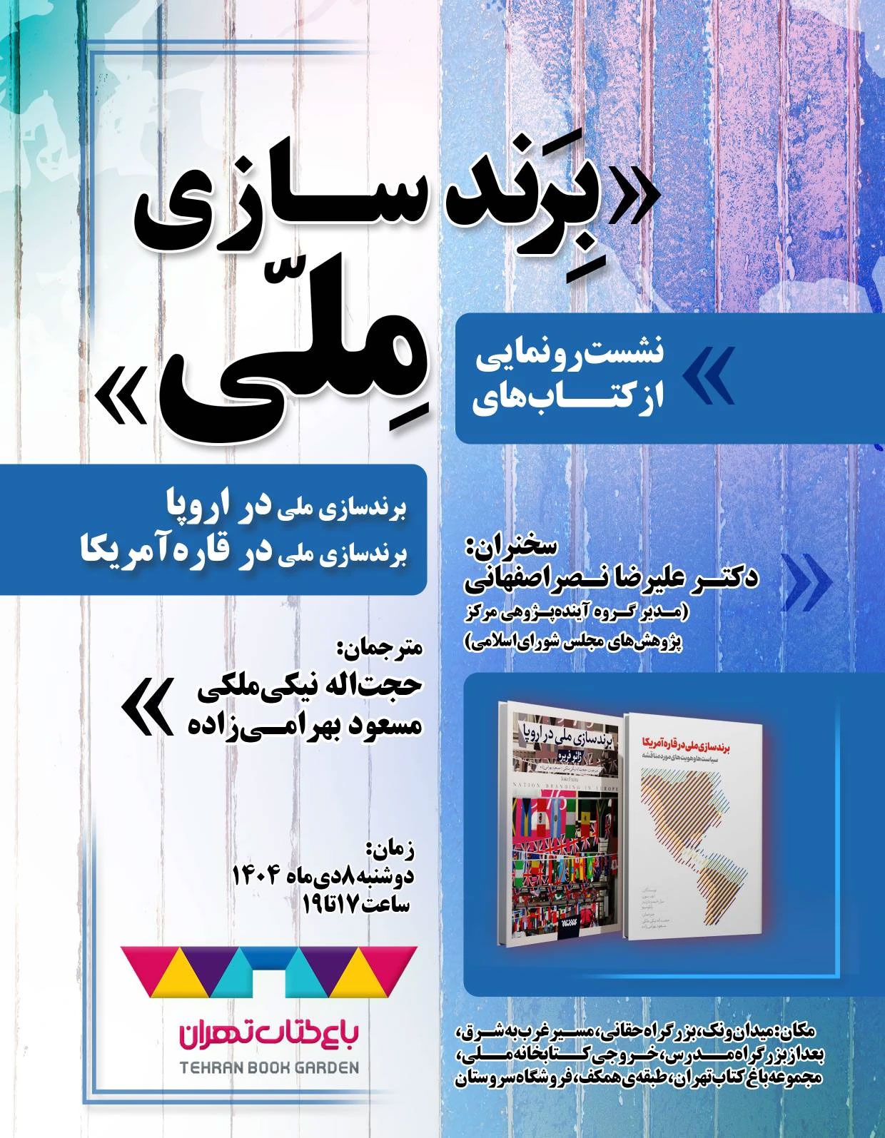 به گزارش روابط عمومی باغ کتاب تهران، رونمایی از کتابهای برندسازی ملی در اروپا و برندسازی ملی در قاره آمریکا عصر دوشنبه ۸ دی ماه ۱۴۰۴ از ساعت ۱۷ تا ۱۹ در باغ کتاب تهران برگزار میشود.