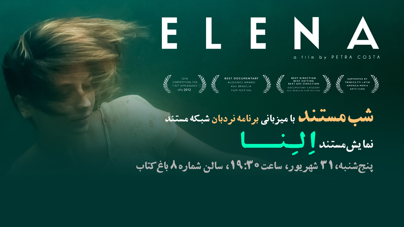 به گزارش روابط عمومی باغ کتاب تهران، چهارمین برنامه «شب مستند» باغ کتاب به نمایش و نقد مستند «النا» به کارگردانی پترا کوشتا محصول سال 2012 سینمای برزیل اختصاص دارد. مستند «النا» روز پنجشنبه 31 شهریور ماه ساعت 19:30 در سالن شماره 8 باغ کتاب نمایش داده می‌شود.