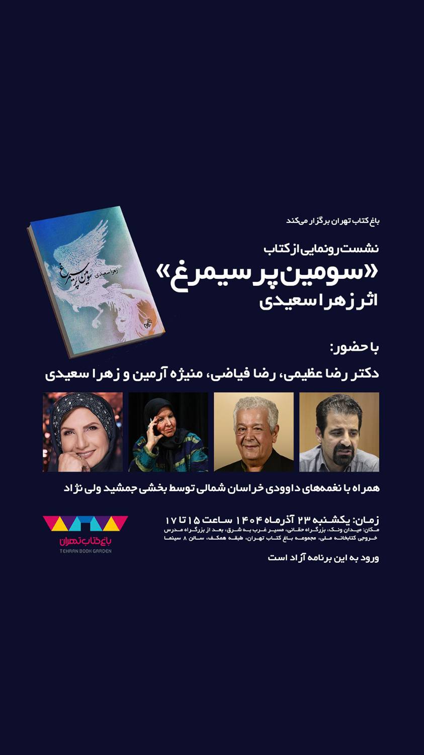 نشست رونمایی از کتاب "سومین پر سیمرغ" اثر زهرا سعیدی یکشنبه 23 اذر ماه 1404 ساعت 15 تا 17 در سالن 8 باغ کتاب تهران با حضور زهرا سعیدی نویسنده، رضا عظیمی، رضا فیاضی و منیژه آرمین برگزار میشود.