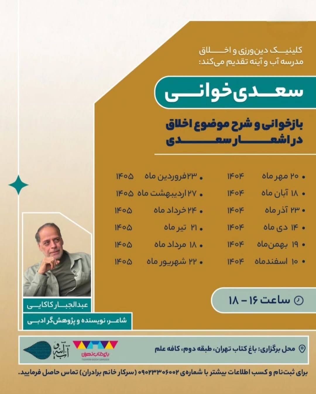 به گزارش روابط عمومی باغ کتاب تهران، چهارمین نشست ماهانه سعدی خوانی با ارائه عبدالجبار کاکایی عصر یکشنبه ۱۴ دی ماه ۱۴۰۴ با حضور علاقهمندان در کافه علم باغ کتاب و با محوریت بررسی بابهای مختلف از بوستان سعدی برگزار شد.